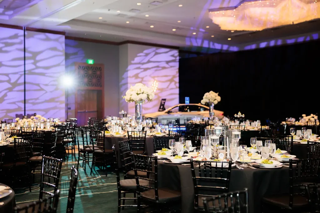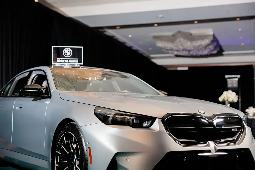 Guests were greeted by white sheer draping, sparkling chandeliers, glowing candelabras, and candlelight, while a live harpist filled the space with soft, ethereal melodies. Inside, the stunning ballroom dazzled with “wow” moments: the LED stage backdrop made a striking statement, and the tables were both dreamy and dramatic, adorned with lush white rose arrangements and flickering candlelight. BMW added an extra touch of luxury, showcasing one of its vehicles right in the ballroom.